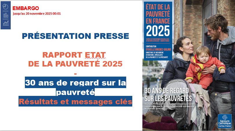Évolution de la pauvreté en France analysée par le Secours Catholique sur une période de 30ans. Le taux des travailleurs pauvres, les femmes et hommes seuls pour élever les enfants, la précarisation numérique, les accidents de santé, la solitude rurale se retrouvent en augmentation sous une opinion du « ils l’ont bien mérité » qui augmente aussi.
